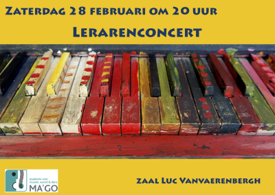 Evenementen Lerarenconcert Halloweentocht initiatieklassen Toonmoment leerlingen Hove Toonmoment klavierinstrumenten Toonmoment leerlingen doorstroom Toonmoment Harmonieorkest Alle evenementen 28 februari 2026 Lerarenconcert Waar? Campus Centrum uur 20u waar Zaal Luc Van Vaerenbergh Onvolledige of foute informatie op deze pagina? Laat het ons weten Leerlingenconcert Oude Muziek 14 februari 2026 Link Leerlingenconcert Hove 5 maart 2026 Link